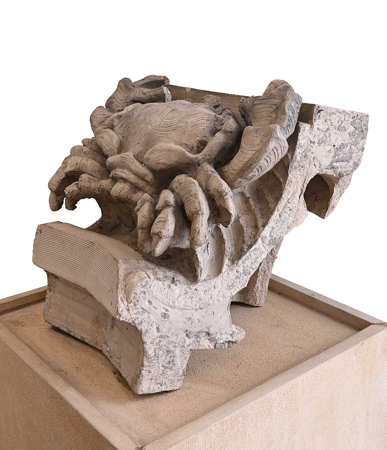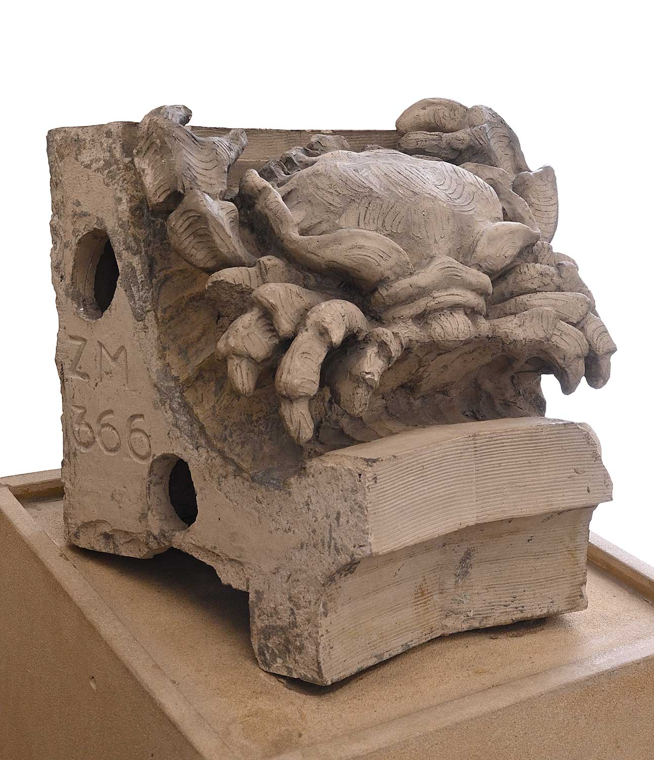 The Southam Building on the corner of 7th Ave and 1st Street SW in Calgary was built in 1913. It later became known as "The Herald Building" after its most prominent tenant, the Calgary Herald newspaper. It was an impressive structure ornamented with many grotesques. (A gargoyle is a decorated waterspout that projects from a roof and carries rainwater away from the walls of a building, protecting it from damage. A grotesque is a decorative carving that has no functional architectural purpose.) These grotesques were designed by Mark Villars Marshall and produced by Royal Doulton at their Lambeth Studio in 1912. The building was demolished in 1972 due to structural problems that could not be amended.