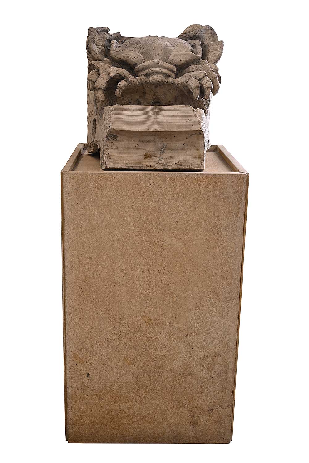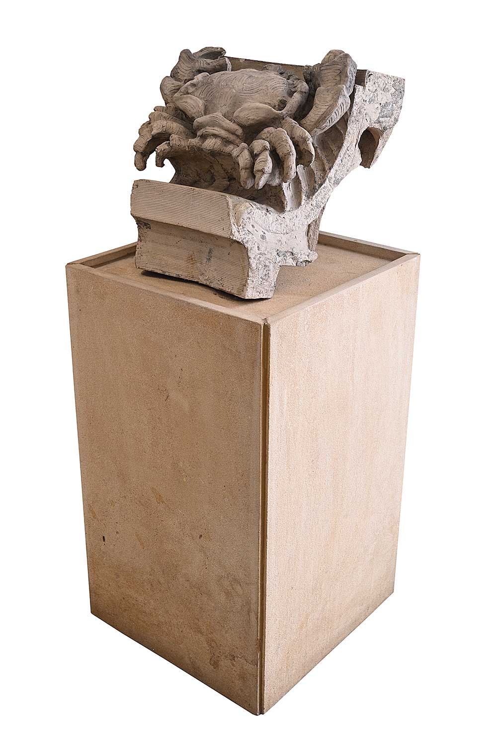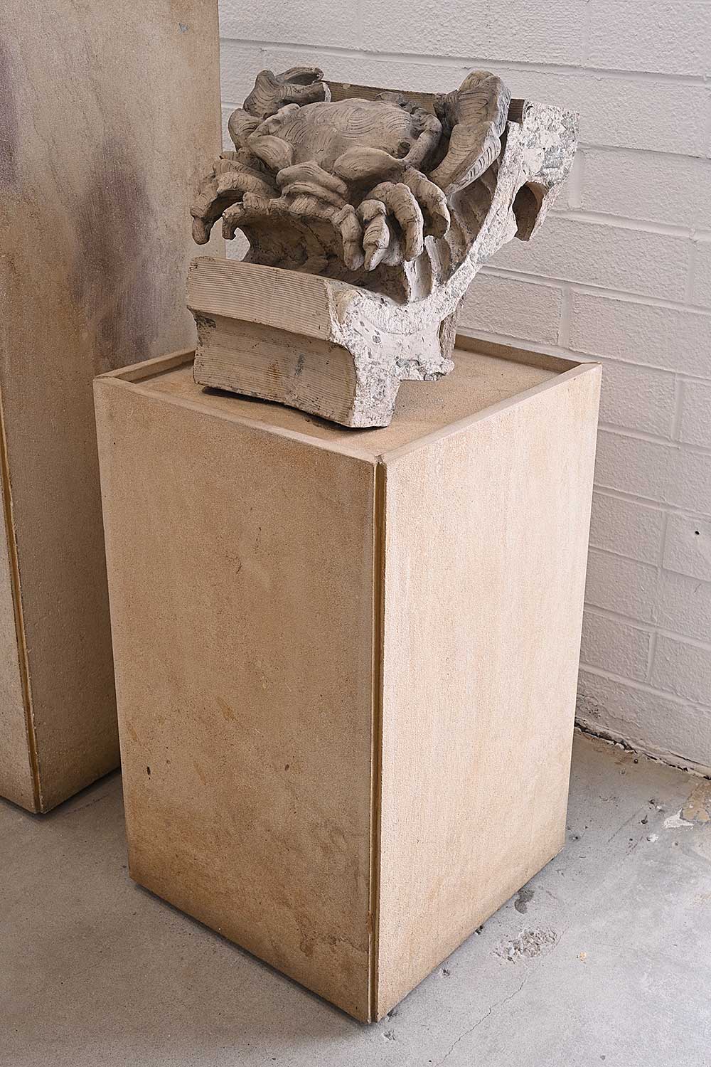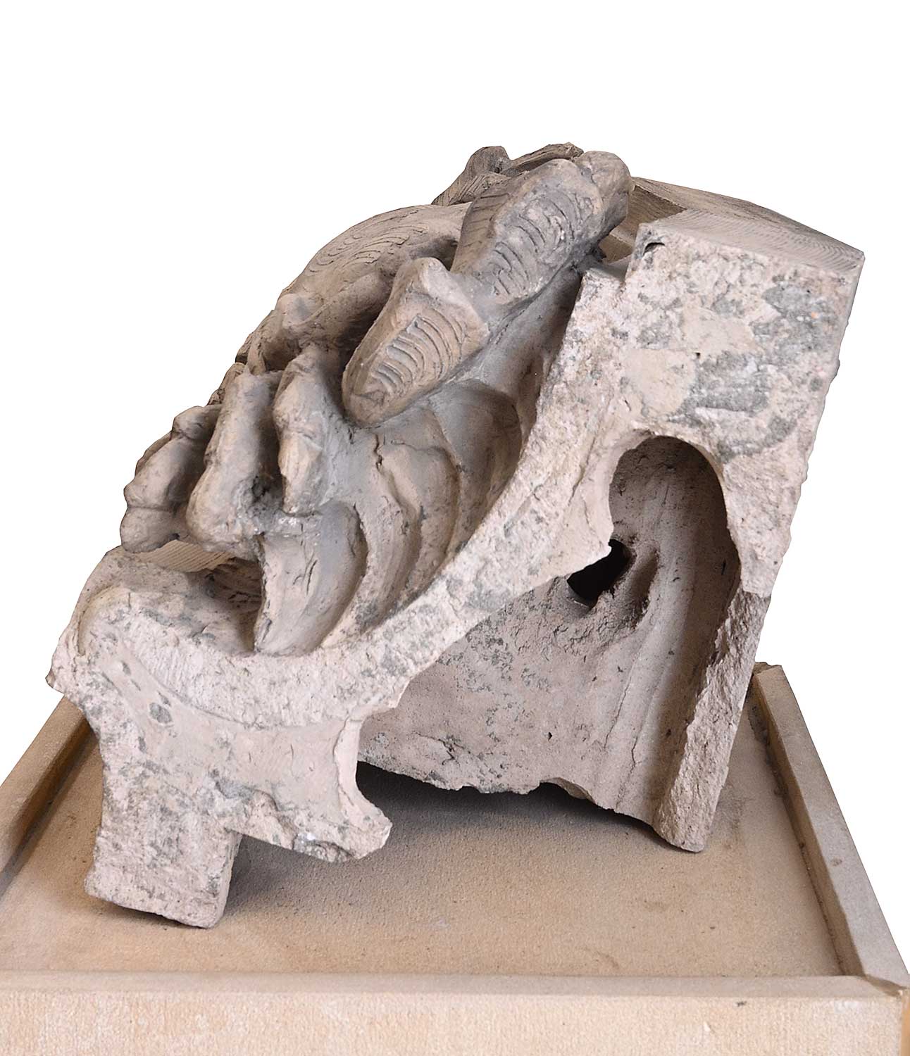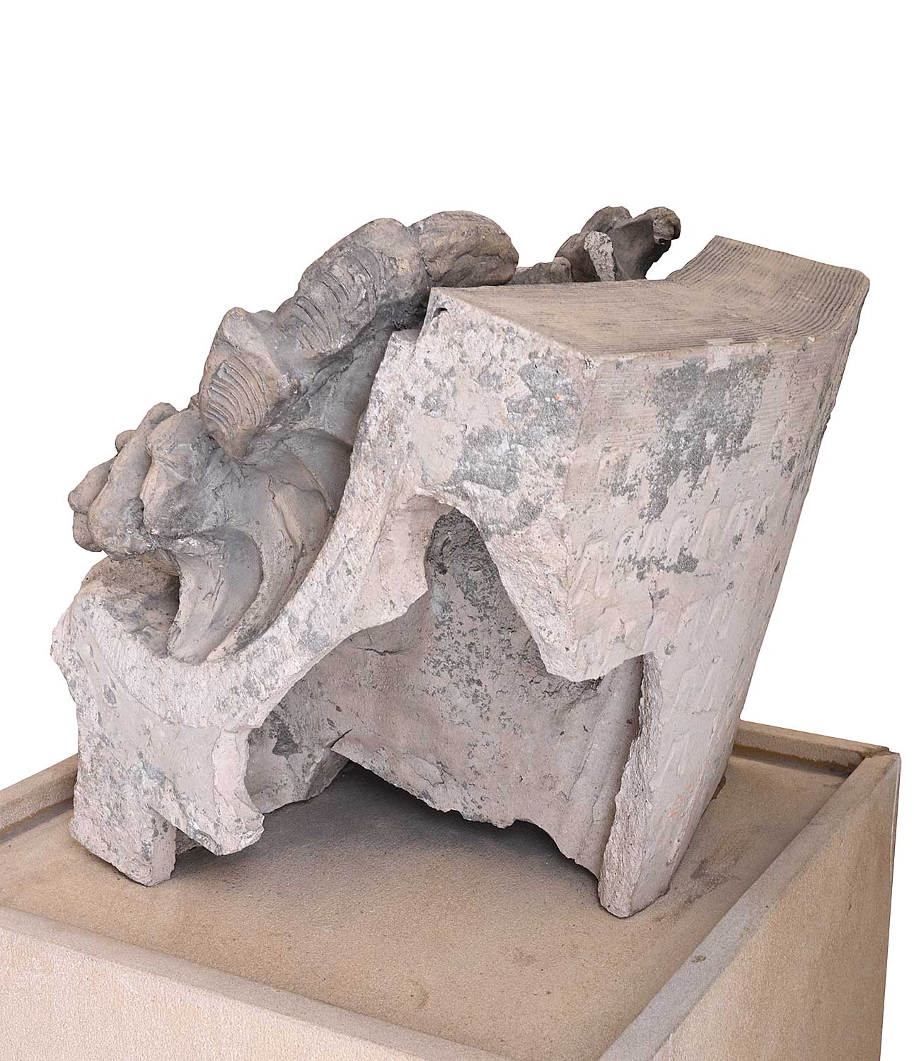 unsigned; secured to very heavy, custom stone plinth measuring [30 x 18 x 17.75 in.]; total size measures [44 x 18 x 17.75 in.]; surface dirt and wear consistent with age of outdoor architectural element; missing edges of top right claw.
