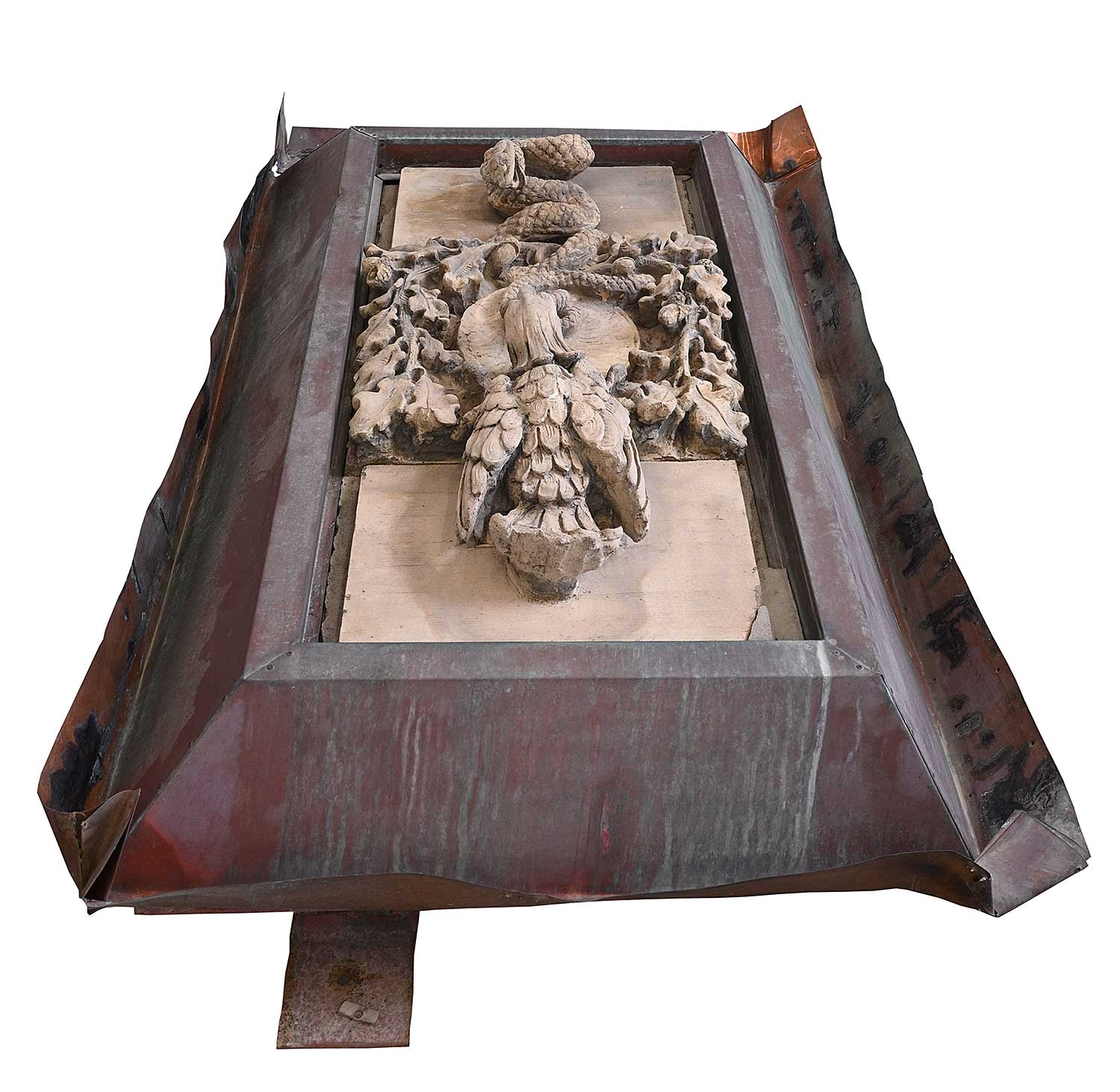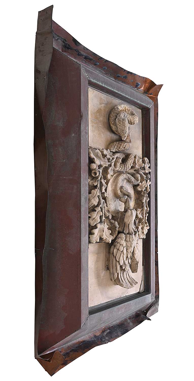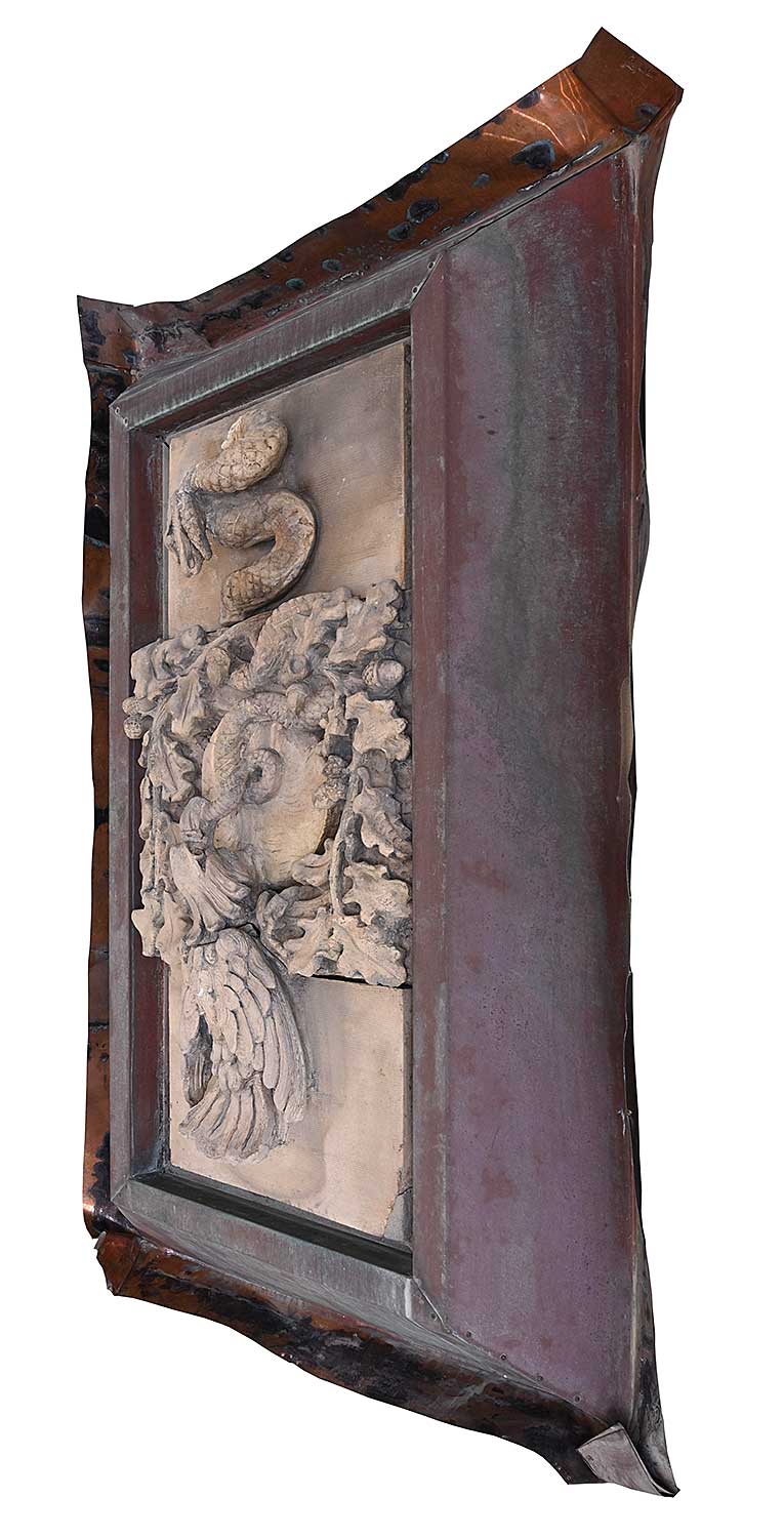 unsigned; set into concrete which has been attached to a steel backing and copper flashing; flashing measures [60 x 38 x 12 in.]; surface dirt and wear consistent with age of outdoor architectural element; chips missing and broken pieces around concrete encasement.