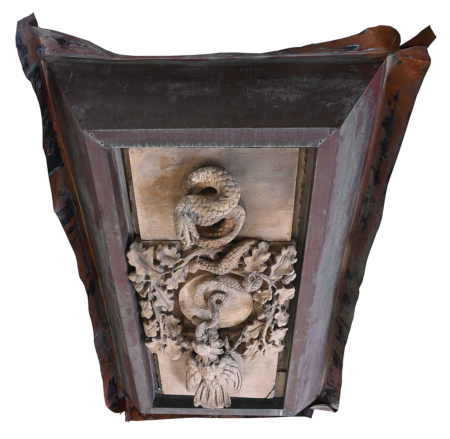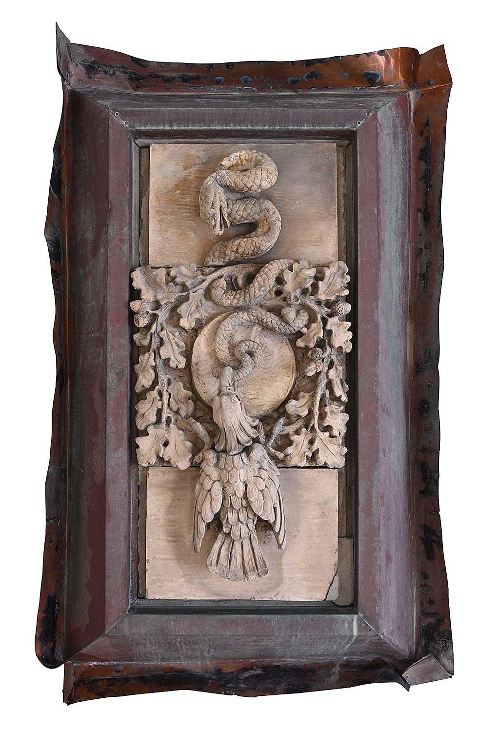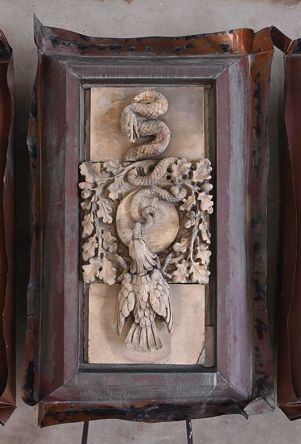 unsigned; set into concrete which has been attached to a steel backing and copper flashing; flashing measures [60 x 38 x 12 in.]; surface dirt and wear consistent with age of outdoor architectural element; chips missing and broken pieces around concrete encasement.