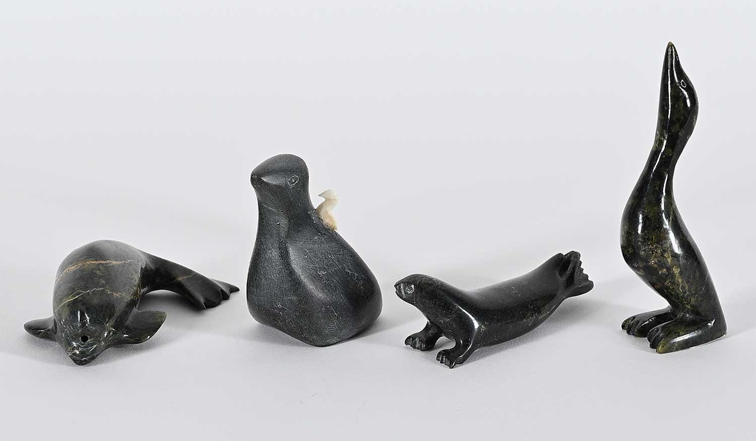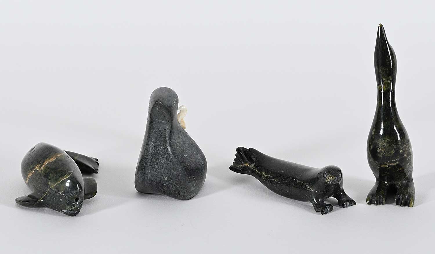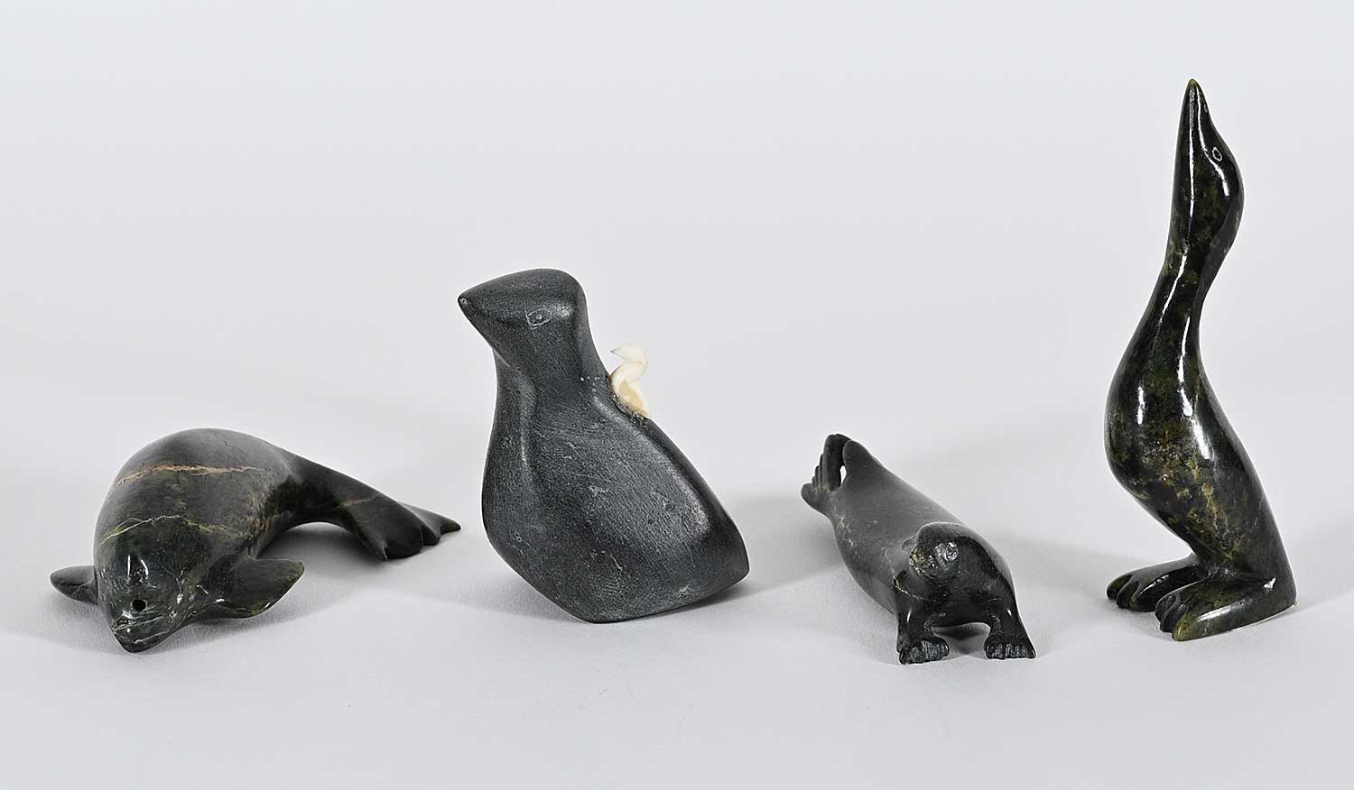 LOT OF FOUR; 'Untitled - Standing Bird' by Ekidluak Teevee; inscribed with syllabics on bottom; measures [4 x 1 x 1 in.], 'Untitled - Mother Bird'; inscribed '-1411' on bottom; measures [2.75 x 2.25 x 1 in.], 'Untitled - Beluga'; inscribed with syllabics on bottom; measures [1 x 3.25 x 2 in.] and 'Untitled - Seal'; inscribed with syllabics on bottom; measures [1 x 3 x 1 in.]