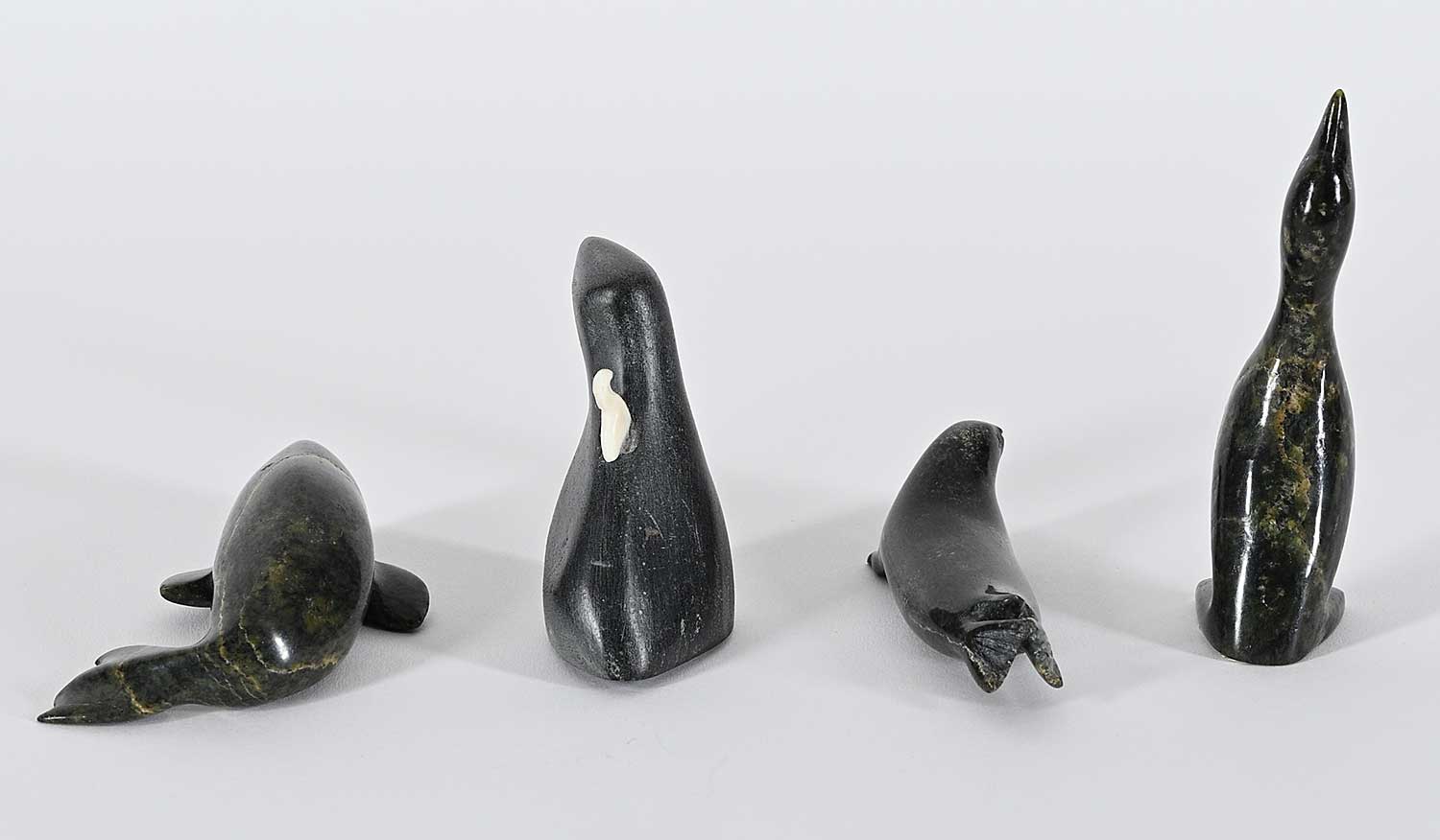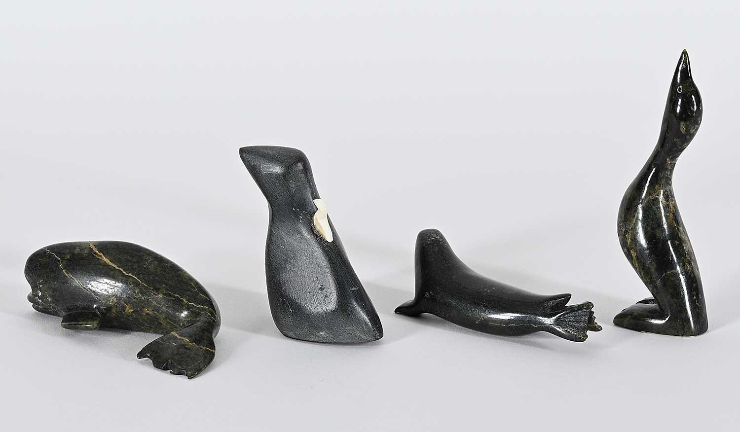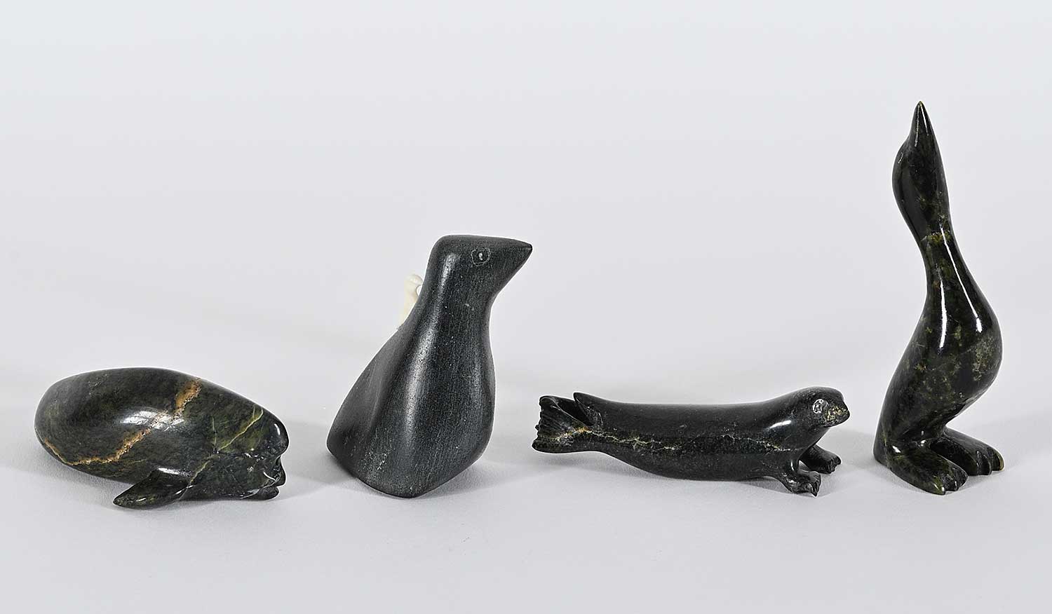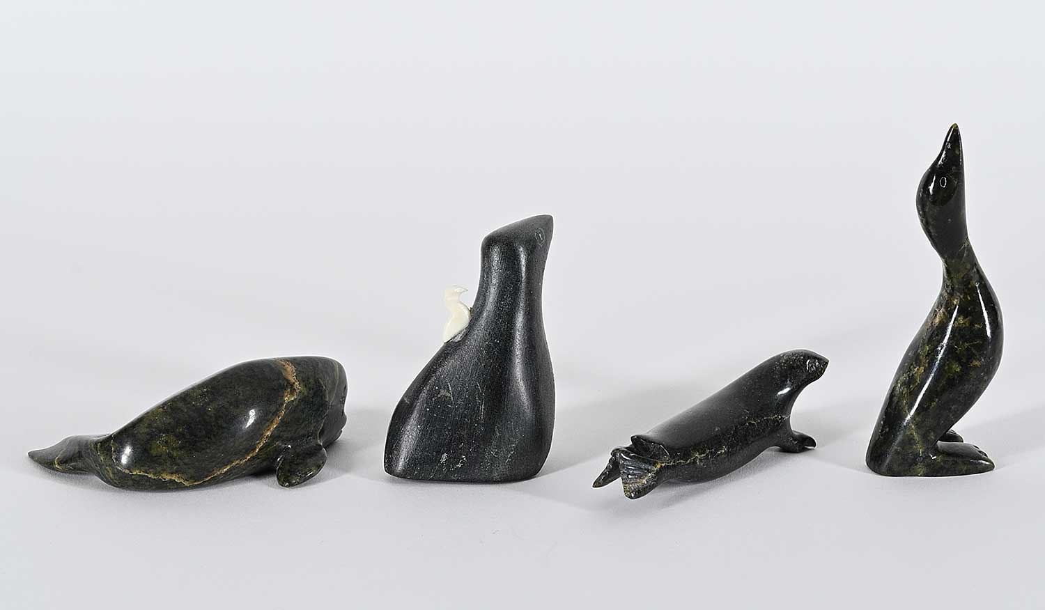 LOT OF FOUR; 'Untitled - Standing Bird' by Ekidluak Teevee; inscribed with syllabics on bottom; measures [4 x 1 x 1 in.], 'Untitled - Mother Bird'; inscribed '-1411' on bottom; measures [2.75 x 2.25 x 1 in.], 'Untitled - Beluga'; inscribed with syllabics on bottom; measures [1 x 3.25 x 2 in.] and 'Untitled - Seal'; inscribed with syllabics on bottom; measures [1 x 3 x 1 in.]