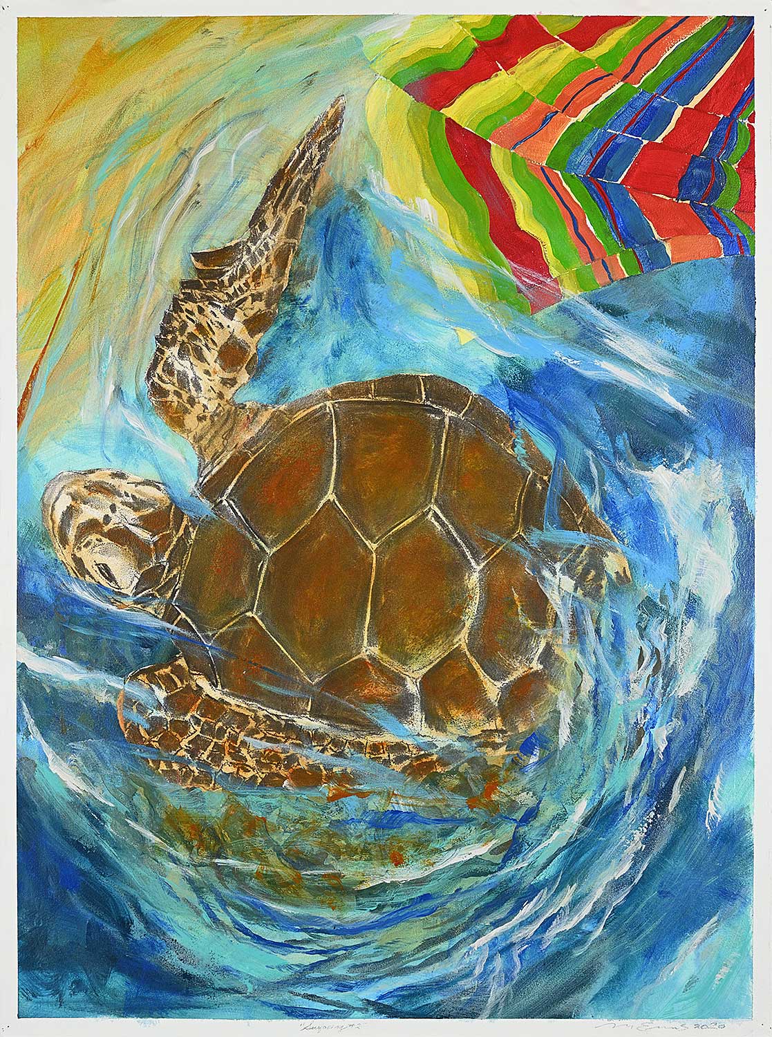 according to the artist 'I photographed turtles swimming ashore and laying eggs at the National Mexican Turtle Centre, Mazunte, Oaxaca. However, plastic six-pack rings often litter the seashore and occasionally ensnare a turtle, leading to its death. This painting is from the series A Plastic Naked Sea, exhibited in Zipolite, Oaxaca, Mexico, 2020.'