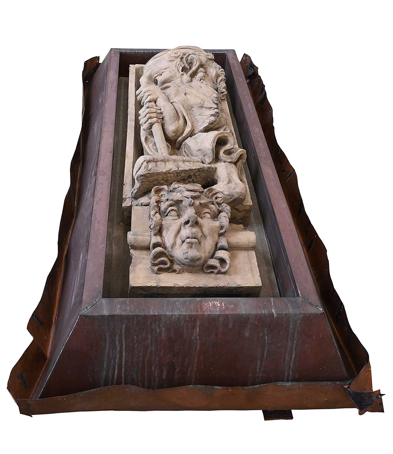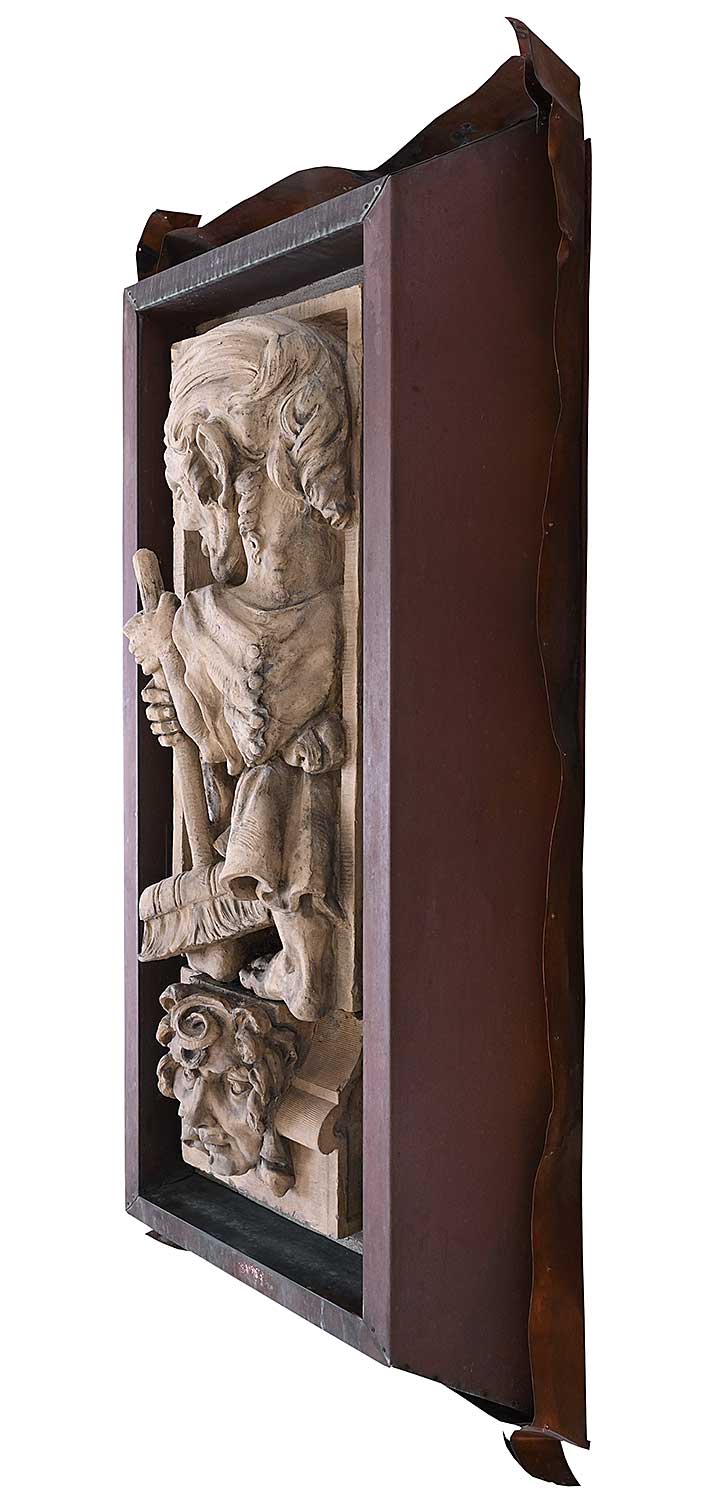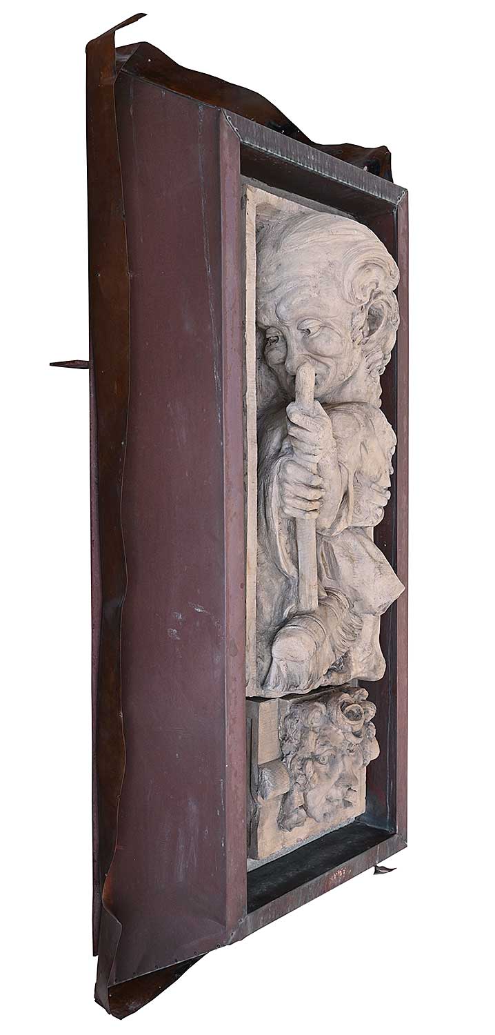 unsigned; set into concrete which has been attached to a steel backing and copper flashing; flashing measures [73 x 35 x 15 in.]; surface dirt and wear consistent with age of outdoor architectural element.
