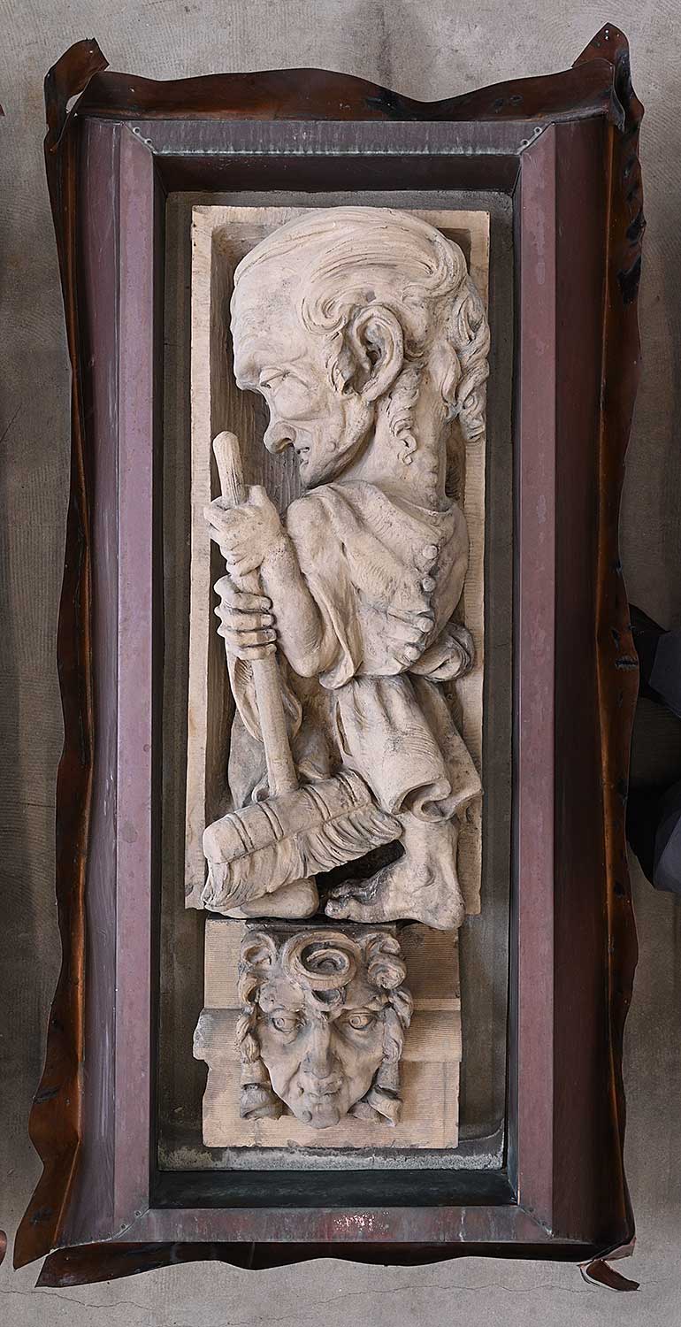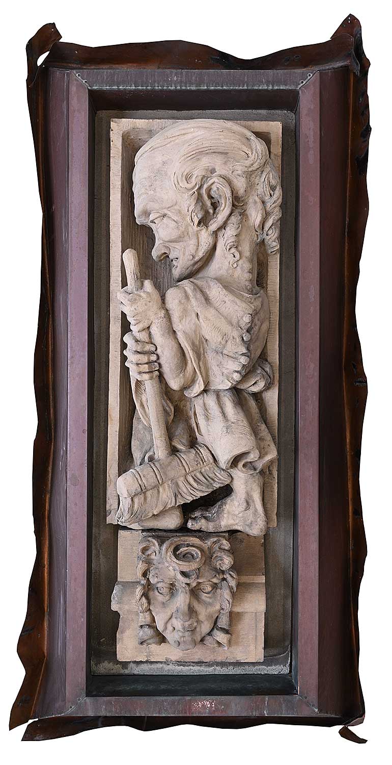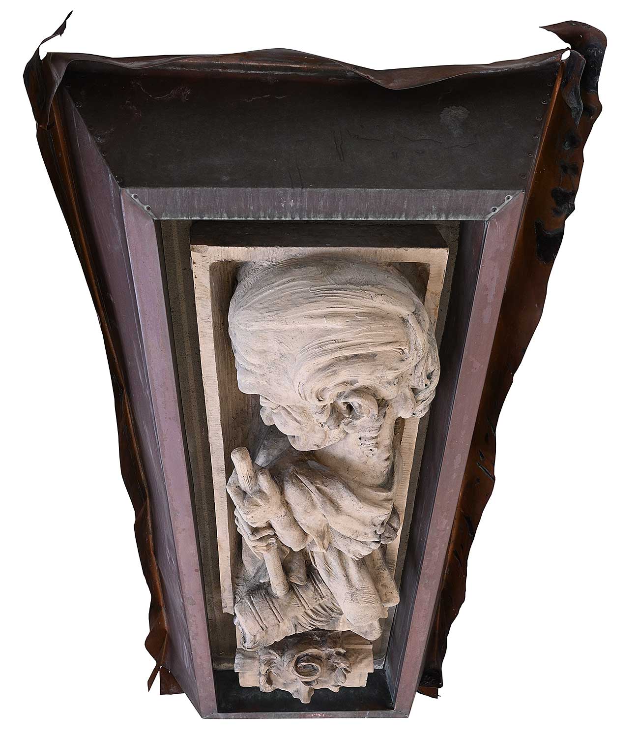 unsigned; set into concrete which has been attached to a steel backing and copper flashing; flashing measures [73 x 35 x 15 in.]; surface dirt and wear consistent with age of outdoor architectural element.