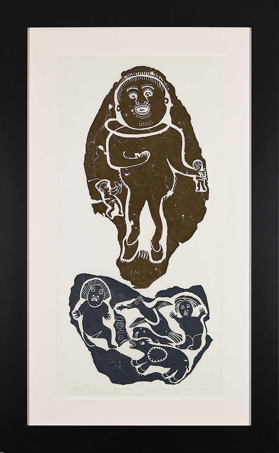 inscribed with syllabics in stone middle centre and lower centre; dated, numbered and inscribed with syllabics along bottom; framed with archival mat and special glass