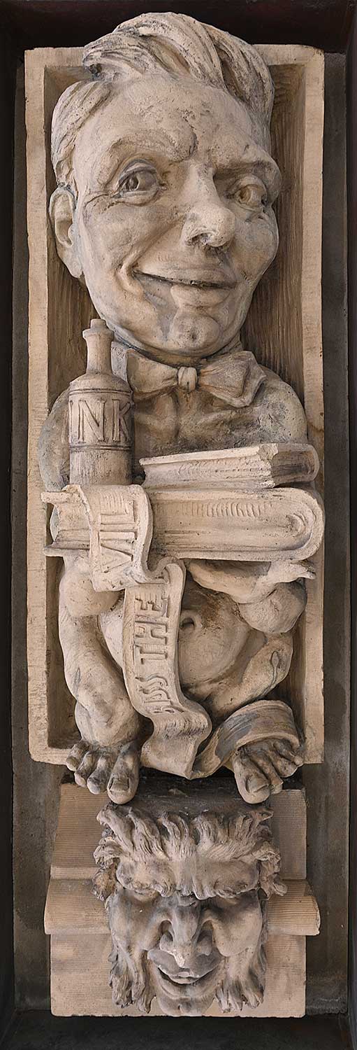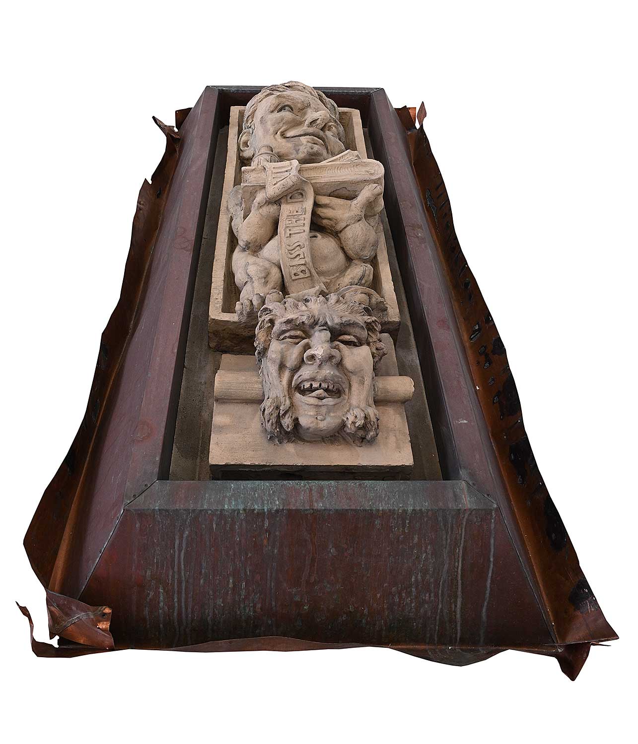 The Southam Building on the corner of 7th Ave and 1st Street SW in Calgary was built in 1913. It later became known as "The Herald Building" after its most prominent tenant, the Calgary Herald newspaper. It was an impressive structure ornamented with many grotesques. (A gargoyle is a decorated waterspout that projects from a roof and carries rainwater away from the walls of a building, protecting it from damage. A grotesque is a decorative carving that has no functional architectural purpose.) These grotesques were designed by Mark Villars Marshall and produced by Royal Doulton at their Lambeth Studio in 1912. The building was demolished in 1972 due to structural problems that could not be amended.