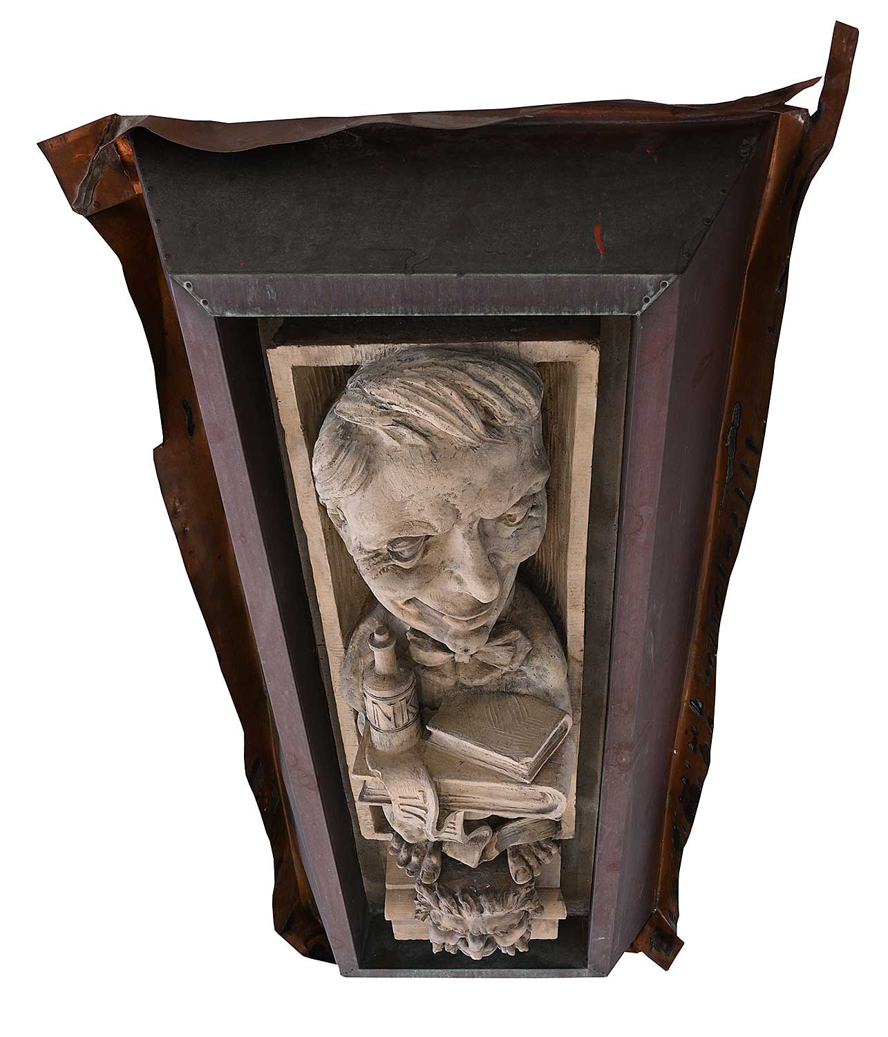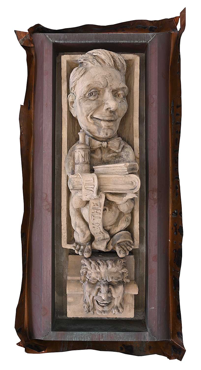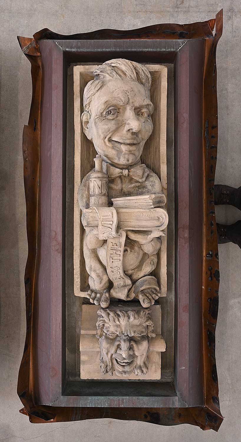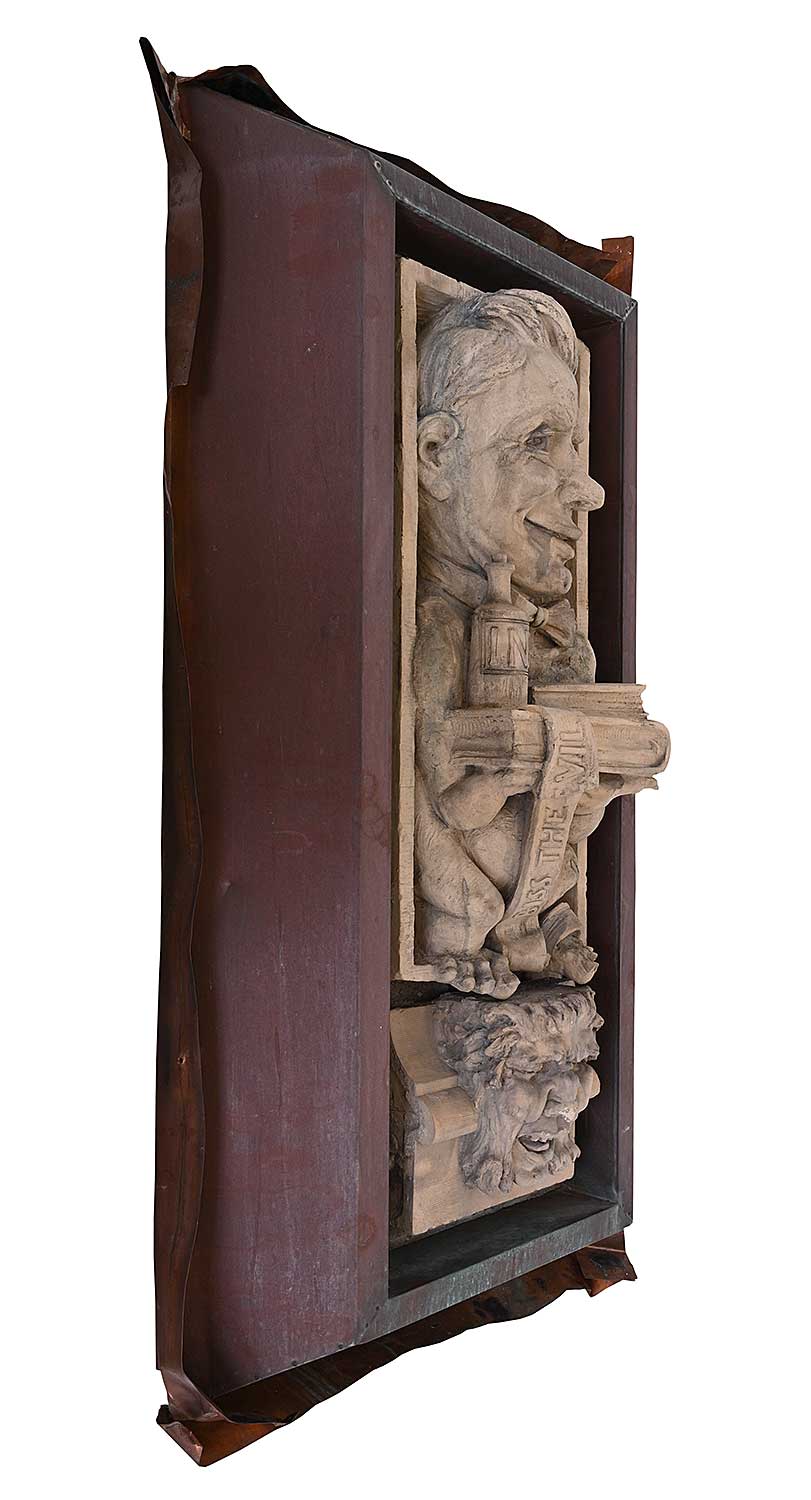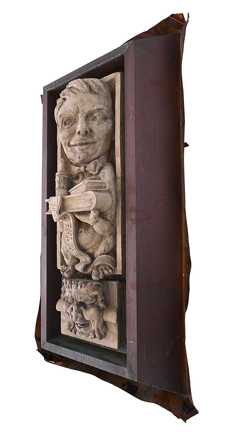 unsigned; titled along bottom; set into concrete which has been attached to a steel backing and copper flashing; flashing measures [75 x 38 x 18 in.]; surface dirt and wear consistent with age of outdoor architectural element; some cracking around bottom face.