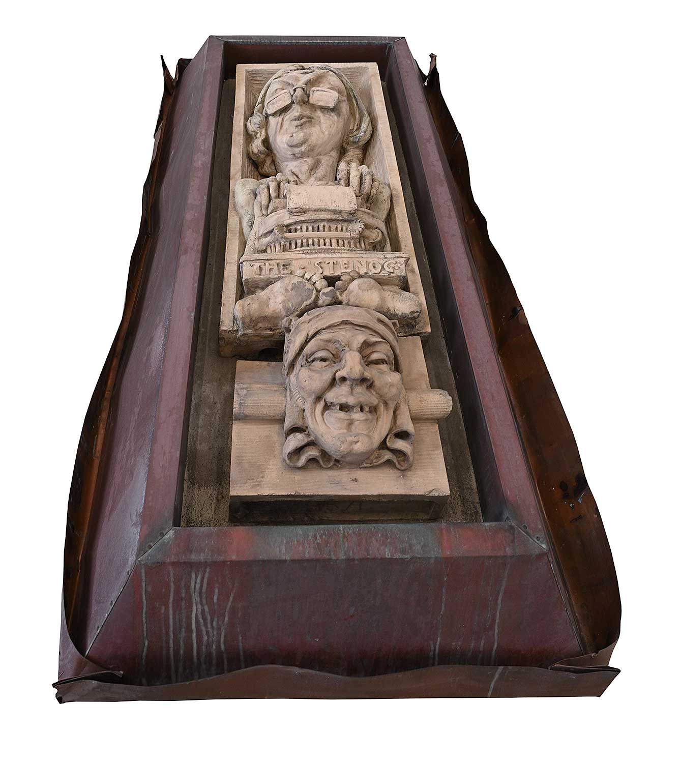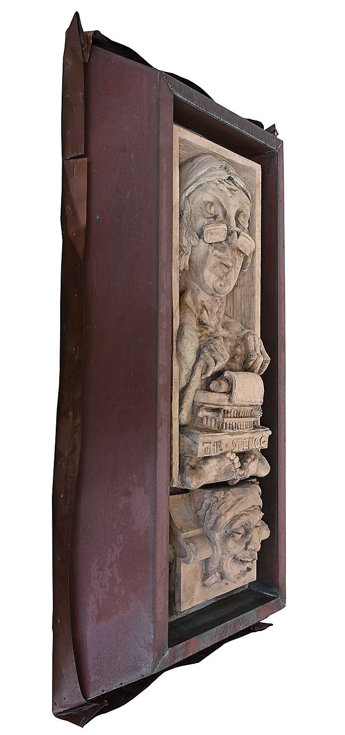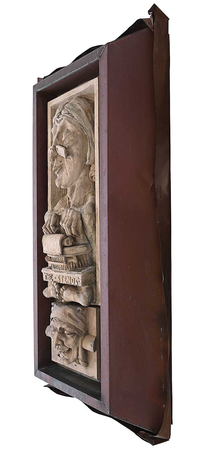unsigned; titled along bottom; set into concrete which has been attached to a steel backing and copper flashing; flashing measures [70 x 34 x 14 in.]; surface dirt and wear consistent with age of outdoor architectural element.