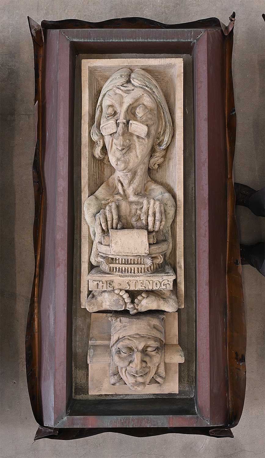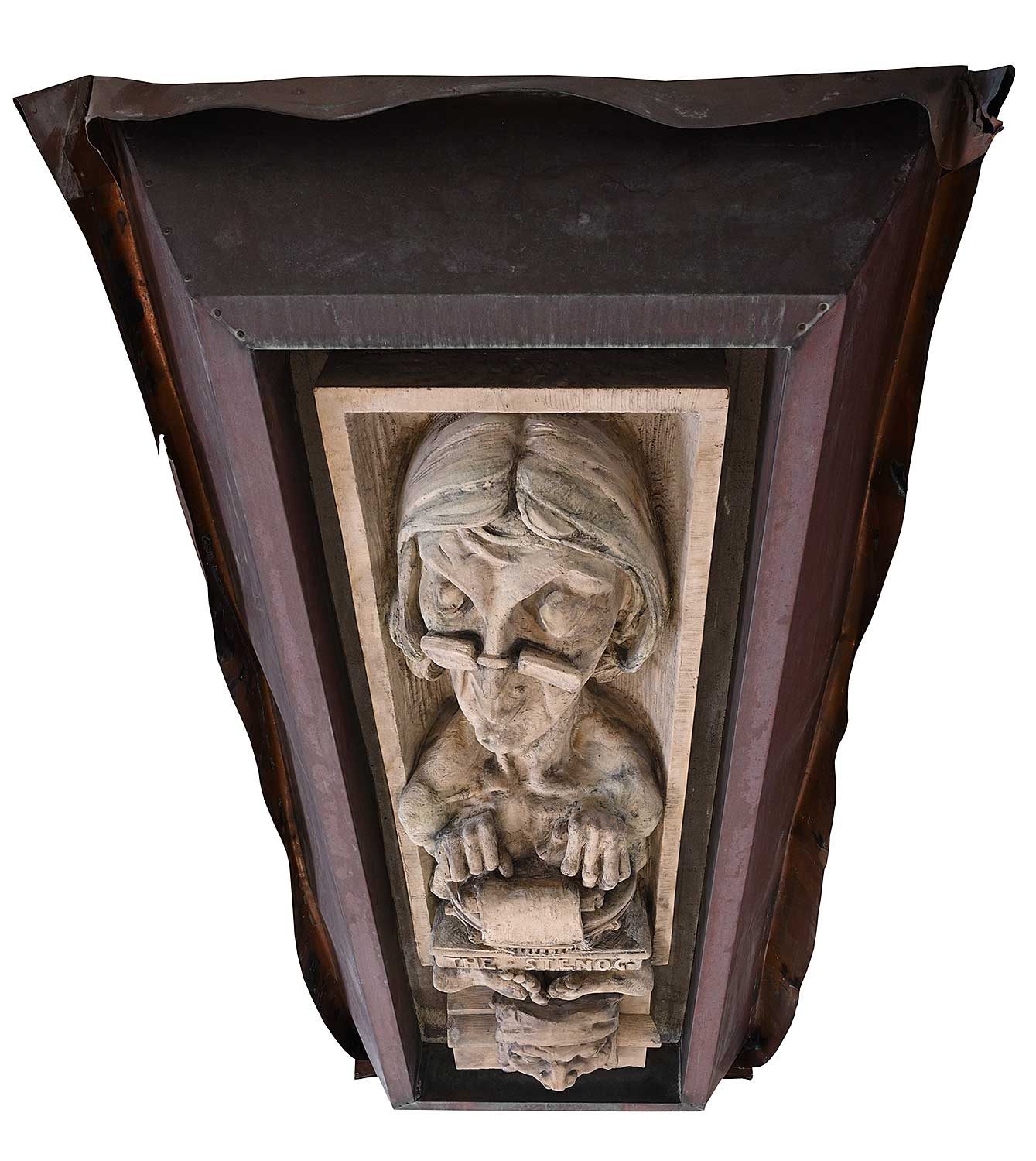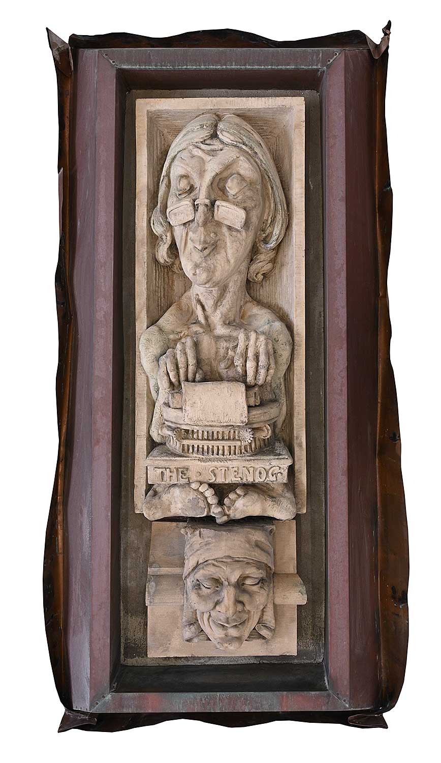 unsigned; titled along bottom; set into concrete which has been attached to a steel backing and copper flashing; flashing measures [70 x 34 x 14 in.]; surface dirt and wear consistent with age of outdoor architectural element.