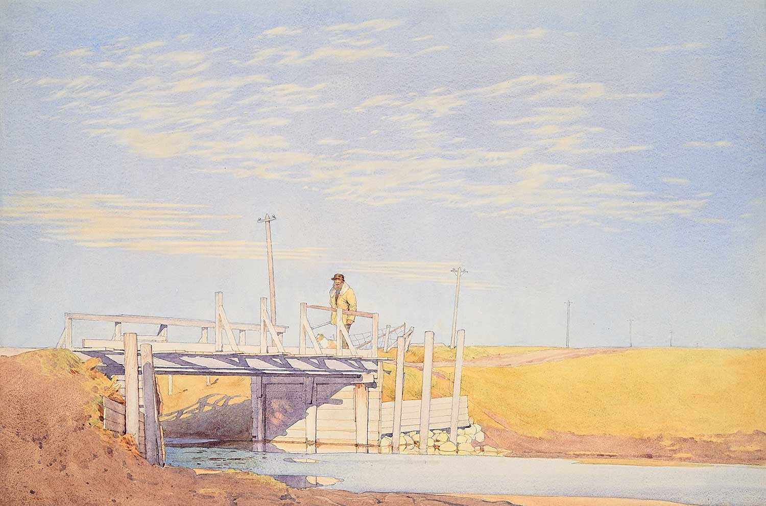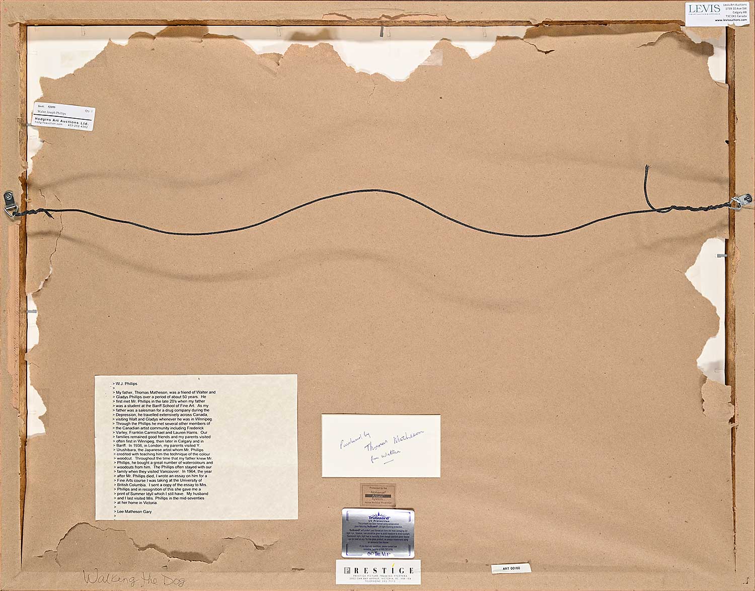bears inscription 'W.J. Phillips - My father, Thomas Matheson, was a friend of Walter and Gladys Phillips over a period of about 50 years. He first met Mr. Phillips in the late 20's when my father was a student at Banff School of Fine Arts. As my father was a salesman for a drug company during the Depression, he travelled extensively across Canada, visiting Walt and Gladys whenever he was in Winnipeg. Through the Phillips he met several other members of the Canadian artist community including Frederick Varley, Franklin Carmichael and Lauren Harris. Our families remained good friends and my parents visited often first in Winnipeg, then later in Calgary and in Banff. In 1936, in London, my parents visited Y. Urushibara, the Japanese artist whom Mr. Phillips credited with teaching him the technique of the colour woodcut. Throughout the time that my father knew Mr. Phillips, he bought a great number of watercolours and woodcuts from him. The Phillips often stayed with our family when they visited Vancouver. In 1964, the year after Mr. Phillips died, I wrote an essay on him for a Fine Arts course I was taking at the University of British Columbia. I sent a copy of the essay to Mrs. Phillips and in recognition of this she gave me a print of Summer Idyll which I still have. My husband and I last visited Mrs. Phillips in the mid-seventies at her home in Victoria. - Lee Matheson Gary' verso